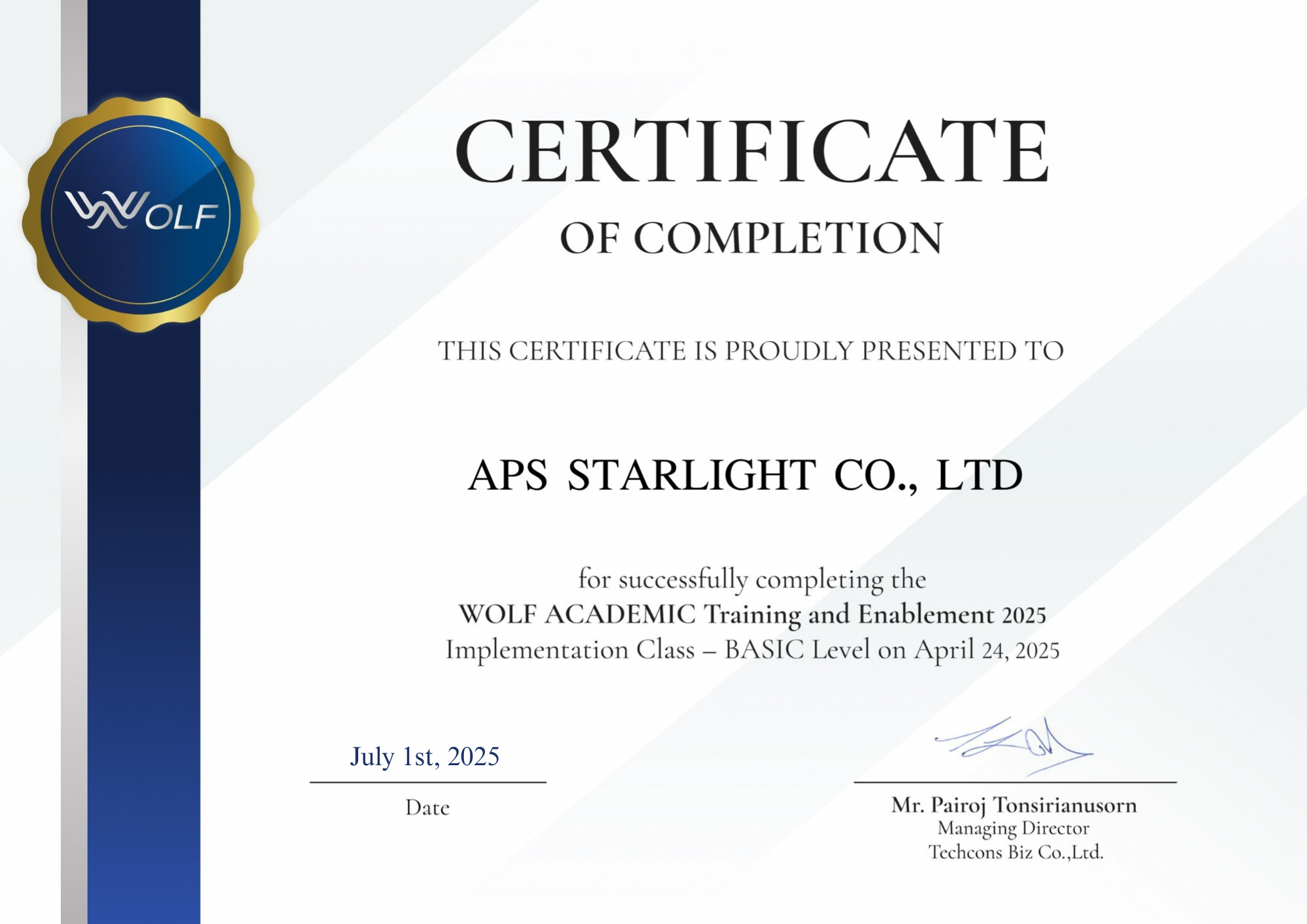 WOLF Certificate For APS STARLIGHT CO., LTD.